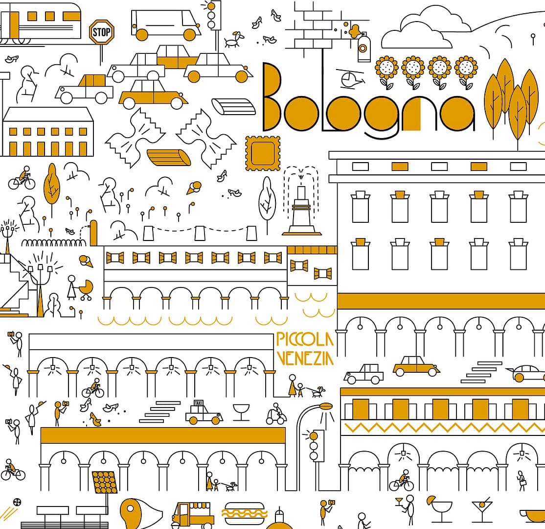 Bologna! Città di tortellini, lasagne, mortadella, Pignoletto e tanto ottimo cibo. Dove è possibile fare una lunghissima passeggiata sotto i portici (di ben 38 km) e arrivare nella Piazza Maggiore, infilarsi in qualche vicolo pieno di banchi di frutta, verdura e ottimi prodotti tipici. Per non parlare dei locali dove mangiare! Adoro il prosciutto crudo e nella mia ultima visita della città sono capitato per caso in un locale bellissimo – “La Prosciutteria” – davvero originale, dove sicuramente tornerò! Questo è il mio disegno dedicato alle meraviglie della città! Naturalmente le bellezze di Bologna sono tantissime, ho cercato di riprodurne il maggior numero.